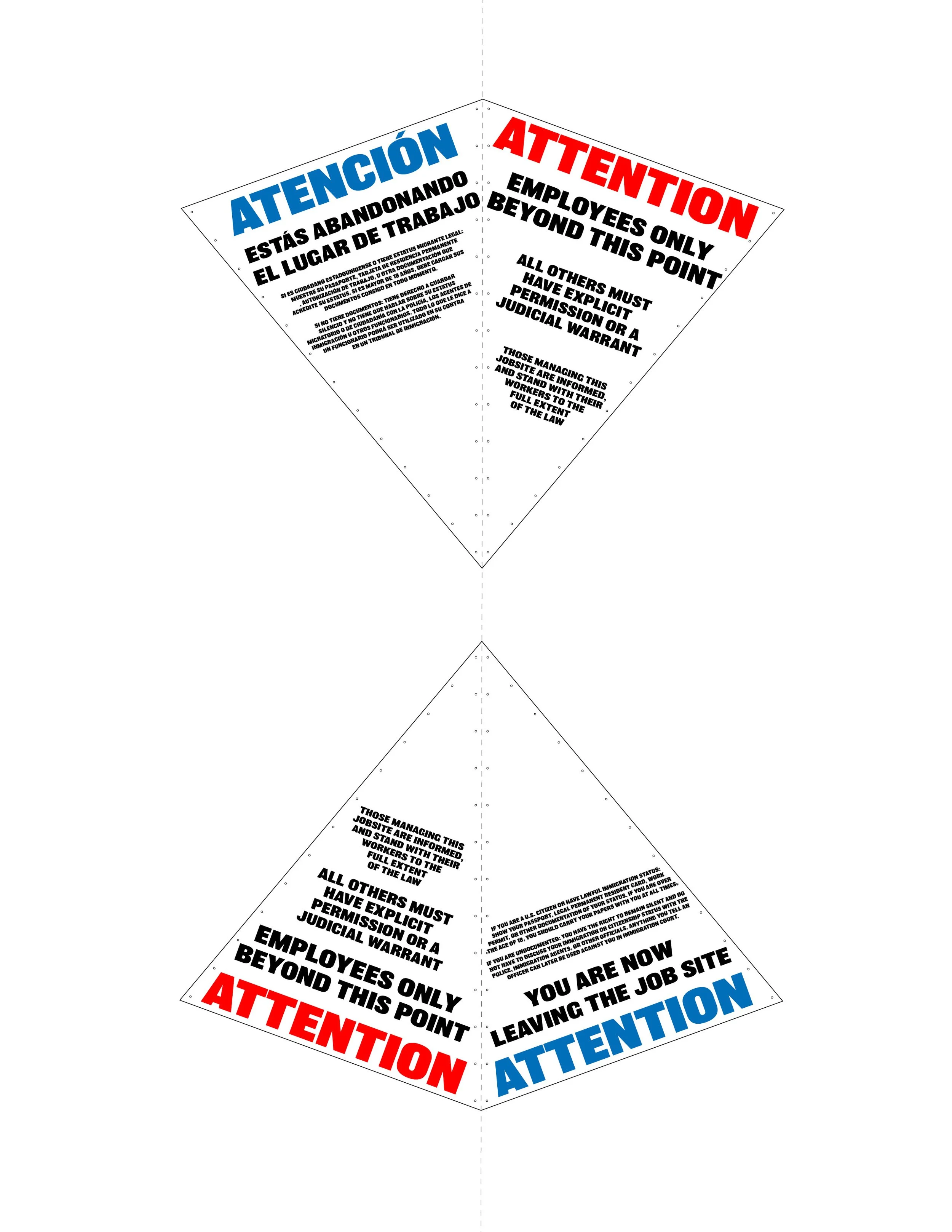 The sign utilizes a pre-existing pin connection found on the diagonal braces to direct its form, latching on to existing fences. Inside the job site, the sign informs workers of their legal rights, undocumented or otherwise, as stated by the National Immigrant Justice Center. Outside the job site, the sign clearly indicates that only workers are allowed beyond it, unless others have explicit permission or a judicial warrant. Architects produce drawings; instructions for carrying out labor. These instructions and their afterlives are filtered through complex bureaucratic and financial structures, alienating designers from the material and political dimension of the work. This project proposes greater proximity between designer and producer, transfiguring a standardized, bureaucratic aesthetic into one of protection and mutual care.